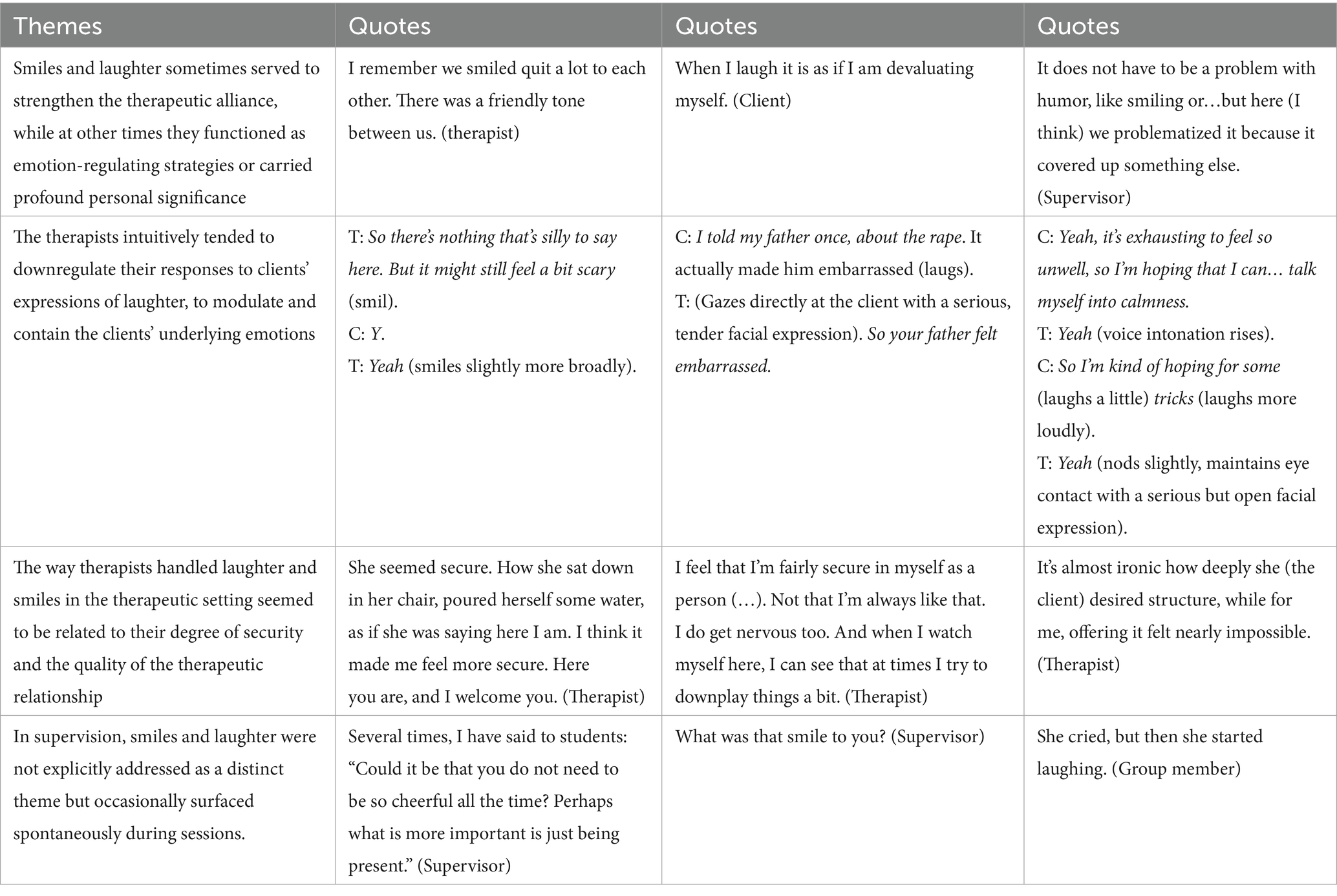 The RTA analysis of the supervision sessions and the IPR interviews yielded four themes: 1. Smiles and laughter sometimes served to strengthen the therapeutic alliance, while at other times they functioned as emotion-regulating strategies or carried profound personal significance; 2. The therapists intuitively tended to downregulate their responses to clients’ expressions of laughter, to modulate and contain the clients’ underlying emotions; 3. The way therapists handled laughter and smiles in the therapeutic setting seemed to be related to their degree of security and the quality of the therapeutic relationship; and 4. In supervision, smiles and laughter were not explicitly addressed as a distinct theme but occasionally surfaced spontaneously during sessions.