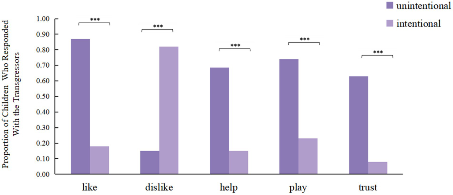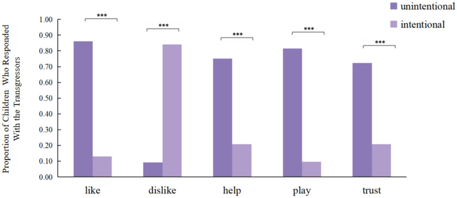 As shown in Figure 1, the children’s response proportions for the five questions regarding unintentional and intentional transgressors are presented. The results of chi-square tests of independence revealed statistically significant associations between intention (unintentional vs. intentional) and children’s responses across all questions (p < 0.001). This indicates that children systematically distinguished between behaviors based on intention and made differential moral judgments toward the transgressors accordingly, confirming that the experimental scenario successfully elicited children’s consideration of intention. Furthermore, chi-square tests showed no significant differences in this intention understanding ability by children’s gender or age (p > 0.05), suggesting that children as young as 4 years old were able to comprehend the transgressor’s intention.