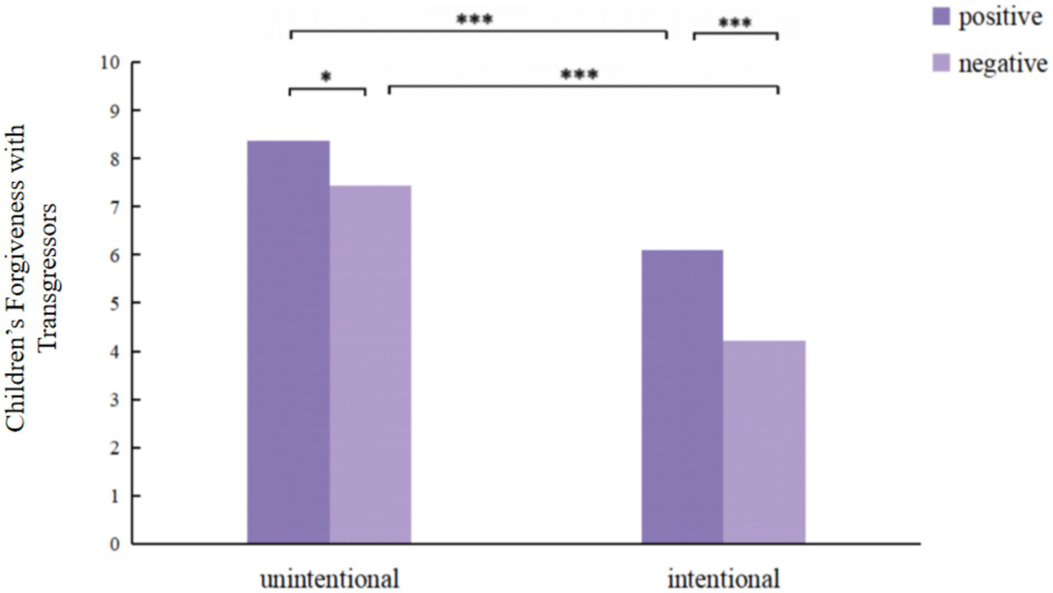 Children’s forgiveness (out of 10) with transgressors on different intention and outcome. *p < 0.05, **p < 0.01, ***p < 0.001.