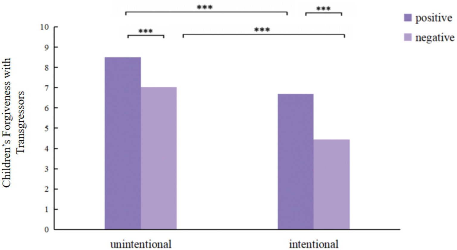 A significant main effect of transgression intention, F(1,174) = 151.563, p < 0.001, ηp2 = 0.466, with children showed more forgiveness for unintentional (M = 7.91, SD = 1.36) than intentional transgressors (M = 5.18, SD = 1.91).