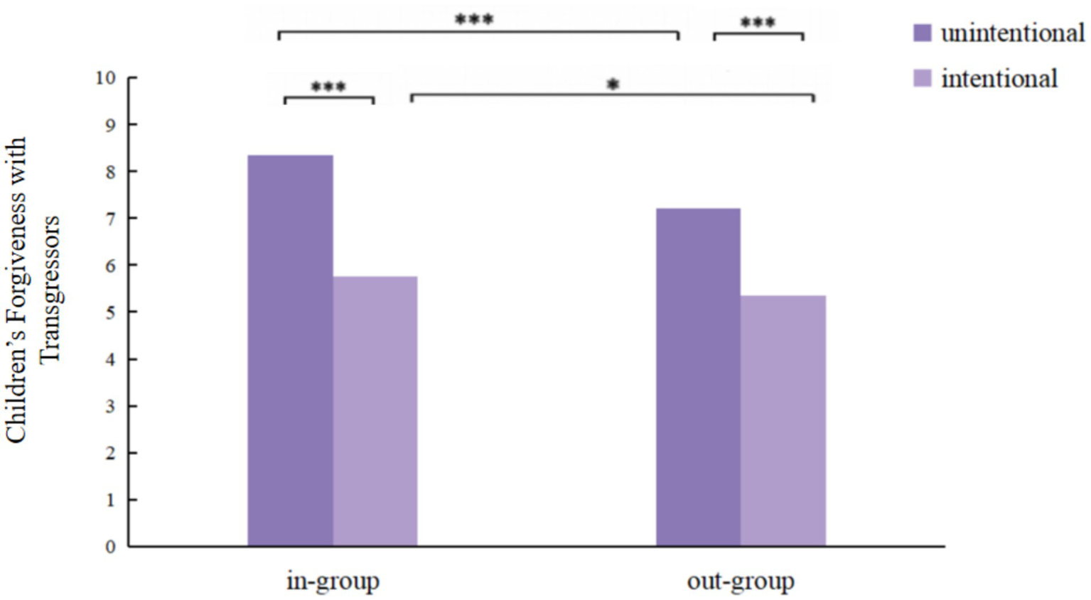 Children’s forgiveness (out of 10) with transgressors on different intention and inter-group relation. *p < 0.05, **p < 0.01, ***p < 0.001.