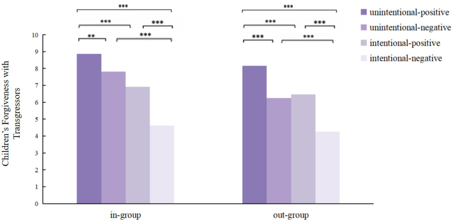 The results indicate that: (1) Children are capable of recognizing a transgressor’s intention and show more forgiveness to unintentional transgressors compared to intentional ones; (2) Children show more forgiveness to unintentional transgressors who cause negative outcomes than intentional transgressors who yield positive outcomes; (3) When an in-group member commits a transgression, children tend to consider intentions, whereas when an out-group member transgresses, they focus more on the outcomes.