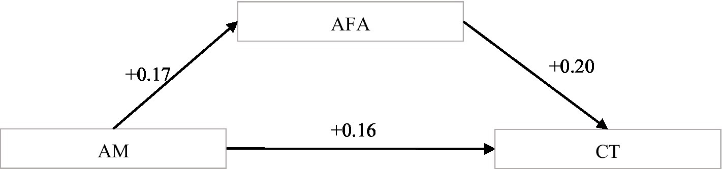 Figure 2. AFA as the mediator between AM and CT. AFA, Anti-Frustration Ability; AM, Achievement Motivation; CT, Creativity Tendency.