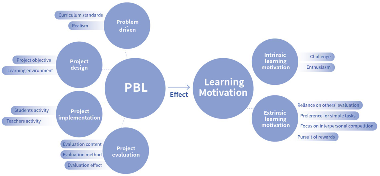 Research on PBL in animation primarily focuses on implementation steps and practical case studies (Wang, 2024). Compared to traditional teaching methods, empirical research findings indicate that PBL has a positive impact on students’ academic achievements, and competencies (Purković and Prihoda, 2020; Zhang and Ma, 2023). For instance, students engaged in PBL demonstrate higher abilities in problem solving, collaboration, and communication (Blumenfeld et al., 1991). PBL also has a positive influence on learning motivation, as students exhibit more initiative and independent in PBL environments and show greater interest and engagement in their learning (Strobel and van Barneveld, 2009). Learning motivation is an important factor that affects learning outcomes. Currently, research on PBL in animation primarily revolves around exploring the integration of PBL with animation course content, while the relationship between PBL and learning motivation remains relatively limited in its investigation.
