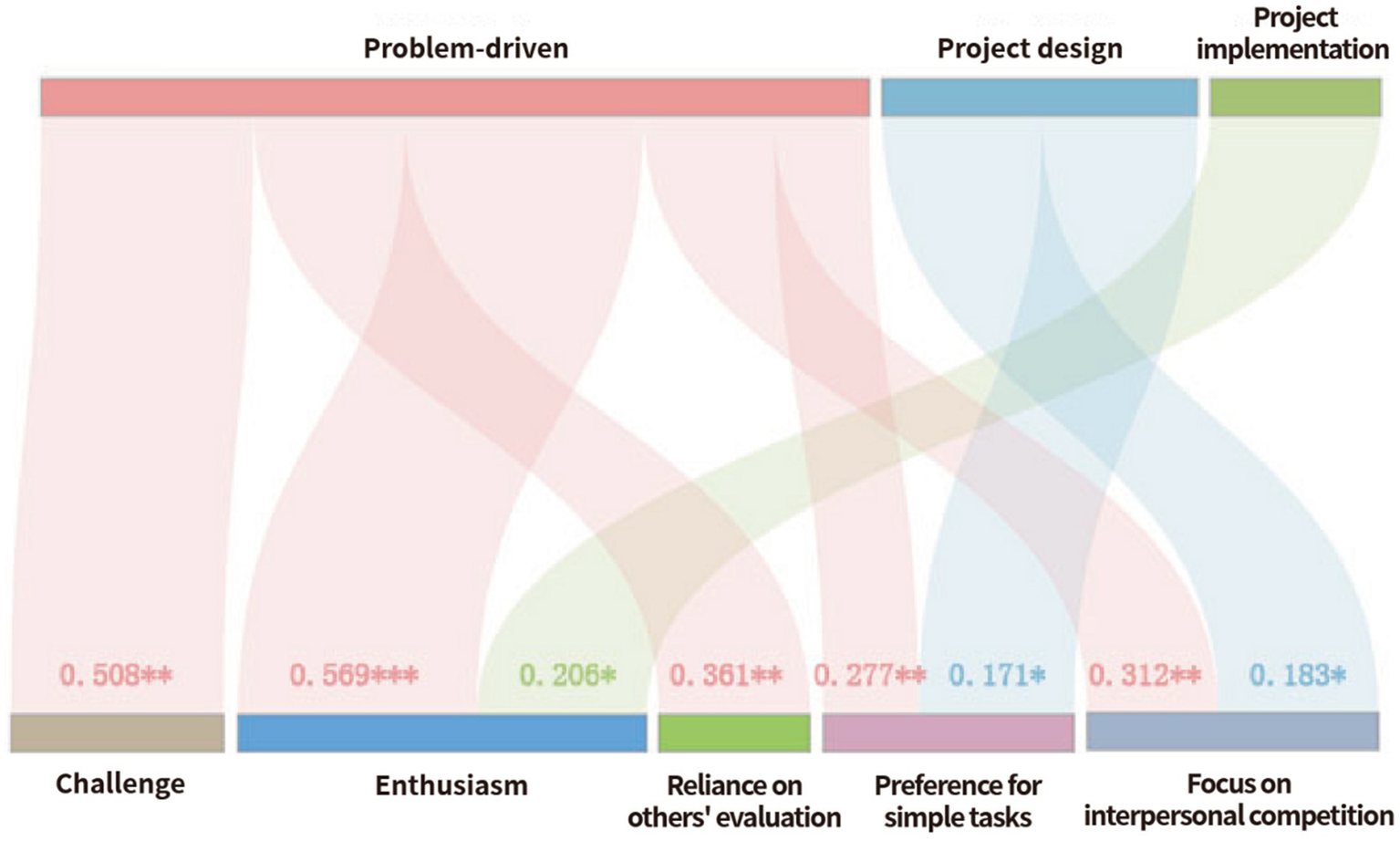 In summary, after controlling for demographic variables, the findings indicate that PBL meaningfully contributes to students’ learning motivation. Among the four dimensions of PBL, the problem-driven component emerged as the most influential predictor, significantly enhancing students’ sense of challenge, enthusiasm, reliance on others’ evaluation, preference for simple tasks, and focus on interpersonal competition. Project design also showed significant positive effects on students’ preference for simple tasks and competitive orientation, while project implementation significantly promoted learning enthusiasm. In contrast, project evaluation did not exert a significant predictive effect on any motivational dimension. In addition, the standardized regression coefficients revealed stronger effects on intrinsic motivation than on extrinsic motivation, suggesting that PBL is particularly effective in fostering students’ interest-driven and self-sustaining engagement in animation learning (see Table 3).