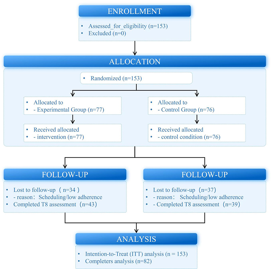 Participant attrition occurred progressively during the 8 week intervention, resulting in 82 participants (53.6%) completing the post-intervention assessment at Week 8 (T8). The primary ITT analysis included all 153 randomized participants using LMM with likelihood-based estimation to handle missing data, while completers-only analyses (n = 82) were conducted as sensitivity checks. Figure 1 shows participant progression and reasons for dropout by group.