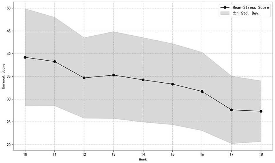 Figure 3 presents the changes in the mean and standard deviation of academic burnout scores in the Mindfulness Experimental Group across different weeks. We can see from the figure that the mean academic burnout scores exhibited a declining trend, starting from approximately 40 at T0. Although there was a slight fluctuation between weeks T2 and T3, scores continued to decrease thereafter, reaching around 27 by T8. Meanwhile, the standard deviation around the mean became narrower over time, indicating a reduction in variability among students. This pattern indicates that the 8 week mindfulness program effectively reduced overall burnout levels and made changes in students' behavior more consistent, verifying the H2 hypothesis. For detailed distributional information, see Supplementary Figure 2.