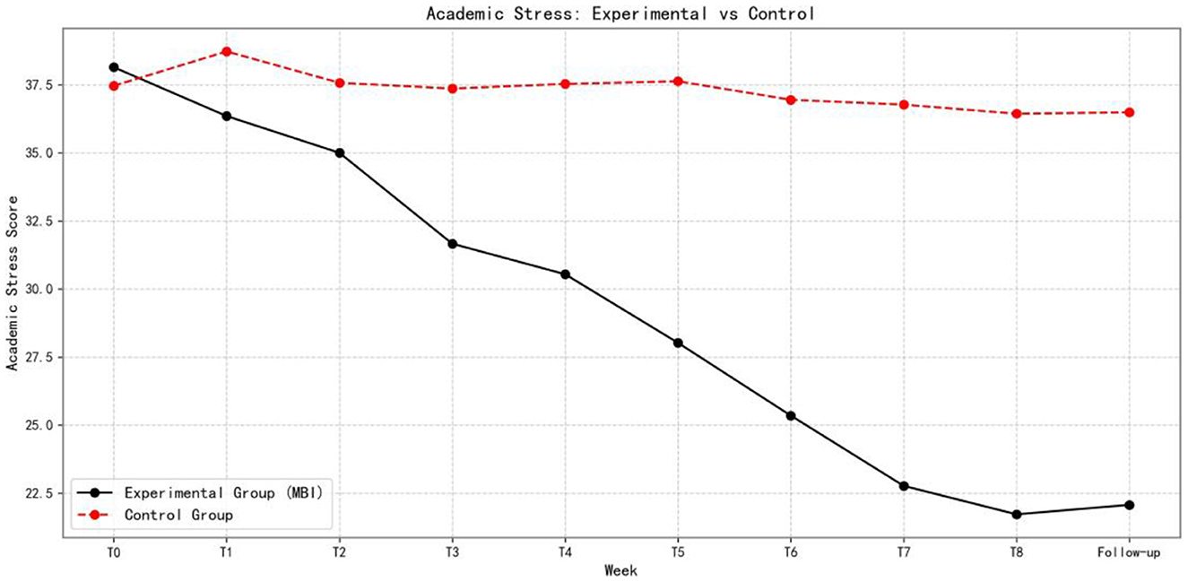 During the intervention and follow-up phases, several noteworthy phenomena were observed. First, for some participants, the reduction in academic stress was not significant during the initial stage of mindfulness training (T1). This may be attributed to the “awareness enhancement effect,” whereby individuals' attention shifts more toward internal experiences in the early stages of practice, leading to heightened sensitivity to their own tension and discomfort. As the training progressed, stress levels began to decline significantly from Week 2 onward and remained low at the end of the intervention (T8) and throughout the follow-up period.