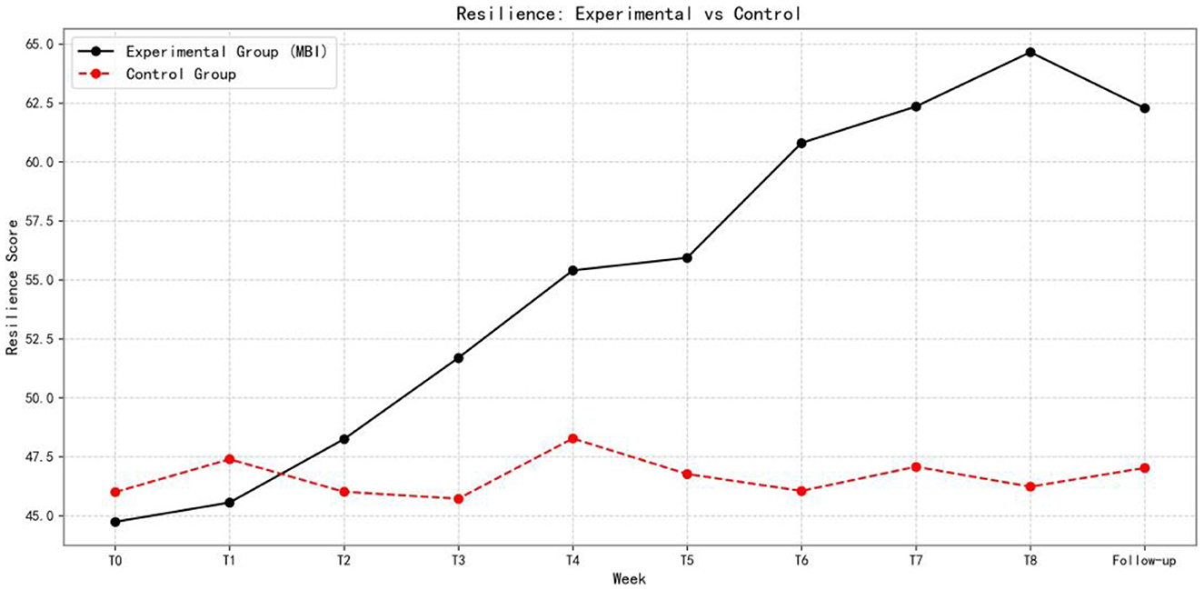 The findings of this study indicate that psychological resilience significantly improved following the mindfulness intervention, and this improvement was maintained throughout the 8 week intervention and the follow-up period (p < 0.001). Students in the Mindfulness Experimental Group demonstrated enhanced emotional regulation and psychological adaptability during the intervention, enabling them to recover more quickly from academic stressors. This suggests that psychological resilience may play a mediating or moderating role in the relationship between mindfulness training and the alleviation of academic stress.