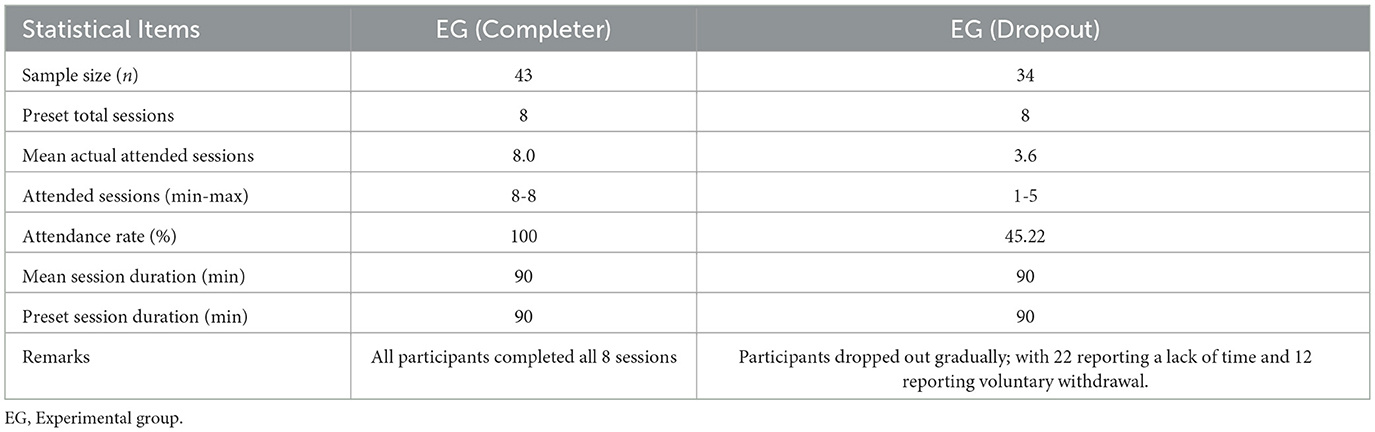 Intervention fidelity and participant attrition were systematically monitored throughout the 8 week program. As shown in Table 1, completers in the experimental group (n = 43) attended all 8 scheduled sessions (100% attendance rate; mean duration = 90 min per session), while dropouts (n = 34) attended an average of 3.6 sessions (range: 1–5; 45.2% attendance rate). Session duration was consistently maintained at the preset 90 mins.