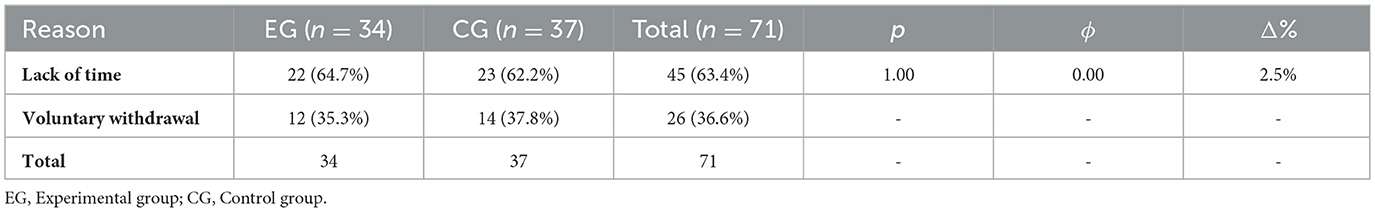 During the study, 82 participants (53.6%) completed the post-intervention assessment at Week 8 (T8) and were included in the final analyses, including 43 in the experimental group and 39 in the control group. A total of 71 participants (46.4%) dropped out before completing the post-intervention assessment. The primary reasons for attrition included lack of time due to academic workload and voluntary withdrawal without stated reasons.
