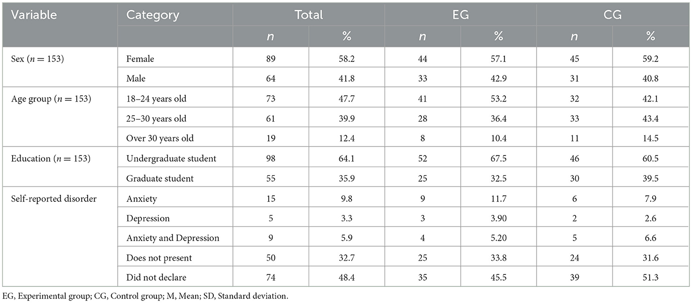Table 3 presents the baseline characteristics of all randomized participants (n = 153), including gender, age group, education level, and self-reported anxiety and depression. Overall, 56.2% of the sample were female and 43.8% were male. Most participants were between 18 and 24 years old (62.1%), followed by 25–30 years old (27.5%) and over 30 years old (10.5%). In terms of education level, 64.1% were undergraduates and 35.9% were postgraduates. The proportion of participants reporting anxiety or depression was relatively low: 9.8% reported anxiety, 3.3% reported depression, 5.9% reported both, and 48.4% did not report either condition.