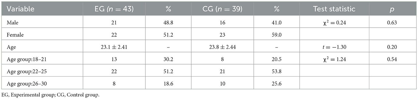 Based on the participants who completed the post-intervention assessment (T8), a total of N = 82 valid participants were included in the final analysis, with n = 43 in the intervention group and n = 39 in the control group. There were no significant differences between the two groups in terms of baseline characteristics such as gender, age, and age group (gender: χ2 = 0.24, p = 0.63; age: t = −1.30, p = 0.20; age group: χ2 = 1.24, p = 0.54), indicating good baseline comparability between groups following random assignment. Additionally, independent-samples t-tests confirmed no significant differences in the primary psychological constructs at baseline, including academic stress (t = 0.26, df = 75.9, p = 0.794, Cohen's d = 0.06), academic burnout (t = −0.66, df = 79.5, p = 0.508, Cohen's d = −0.15), and psychological resilience (t = −0.66, df = 76.2, p = 0.509, Cohen's d = −0.15), further supporting the comparability of the intervention and control groups (see Table 4). The means, standard deviations, and age distributions of baseline psychological measures showed that both groups had similar values, with moderate variability and no extreme outliers. Detailed data are presented in Table 4, which summarizes the baseline characteristics of participants in the intervention and control groups. Table 5, which presents the baseline comparisons of psychological constructs.