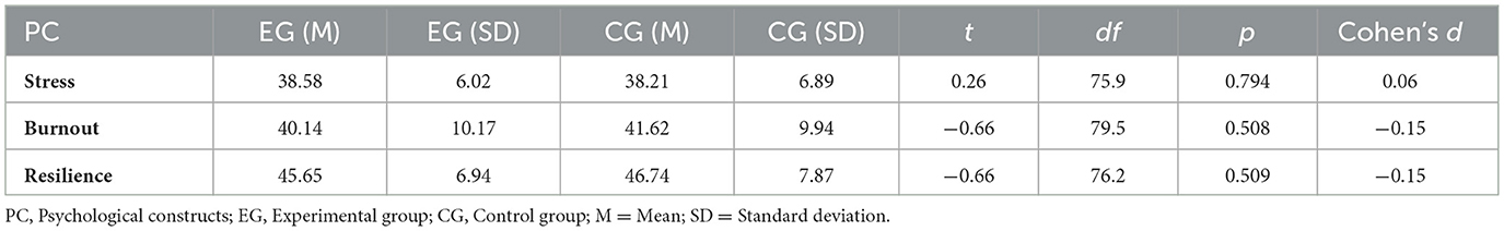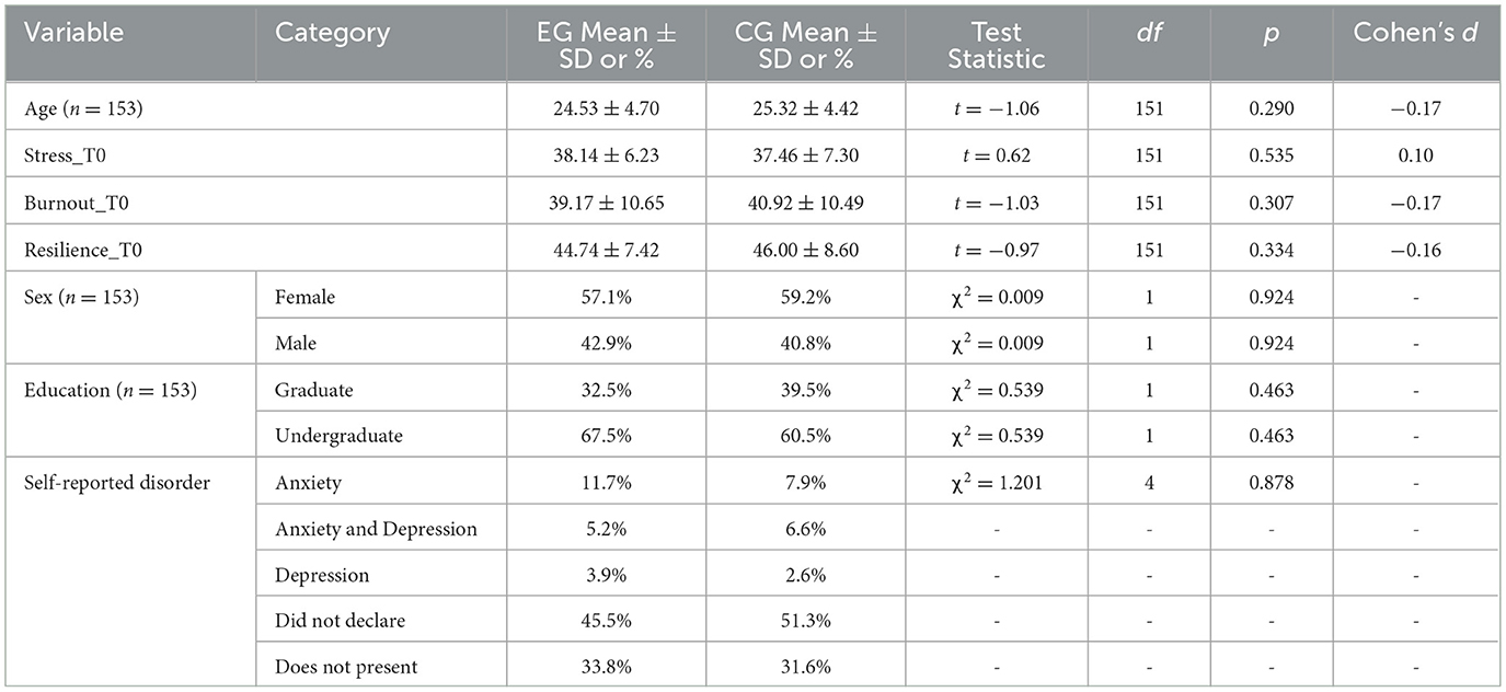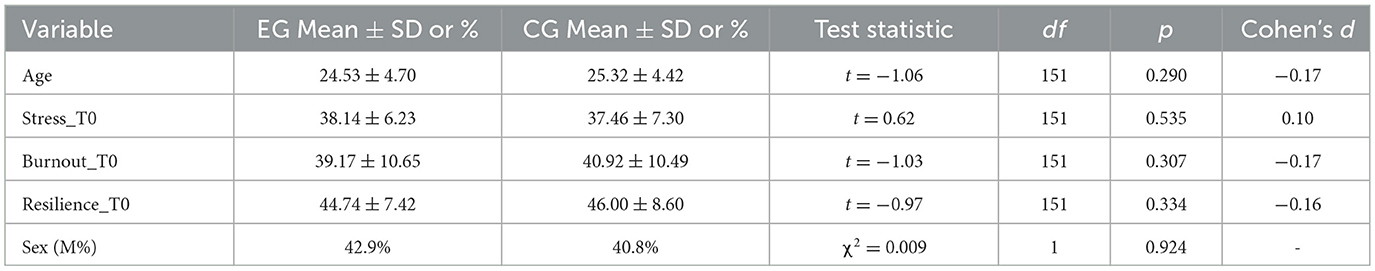 Table 6 presents the baseline characteristics of all randomized participants (n = 153), including age, sex, education, self-reported psychological disorders, and baseline scores for academic stress, burnout, and resilience. Statistical tests show no significant differences between the experimental and control groups, indicating successful randomization and baseline comparability.