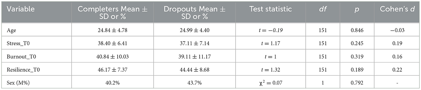 Baseline demographic and psychological characteristics were compared between the experimental and control groups. Chi-square tests were used for categorical variables, and independent-samples t-tests with Levene's correction were conducted for continuous variables. A full-sample (ITT) baseline comparison was conducted first to confirm successful randomization, followed by a completer–dropout comparison to check attrition bias.