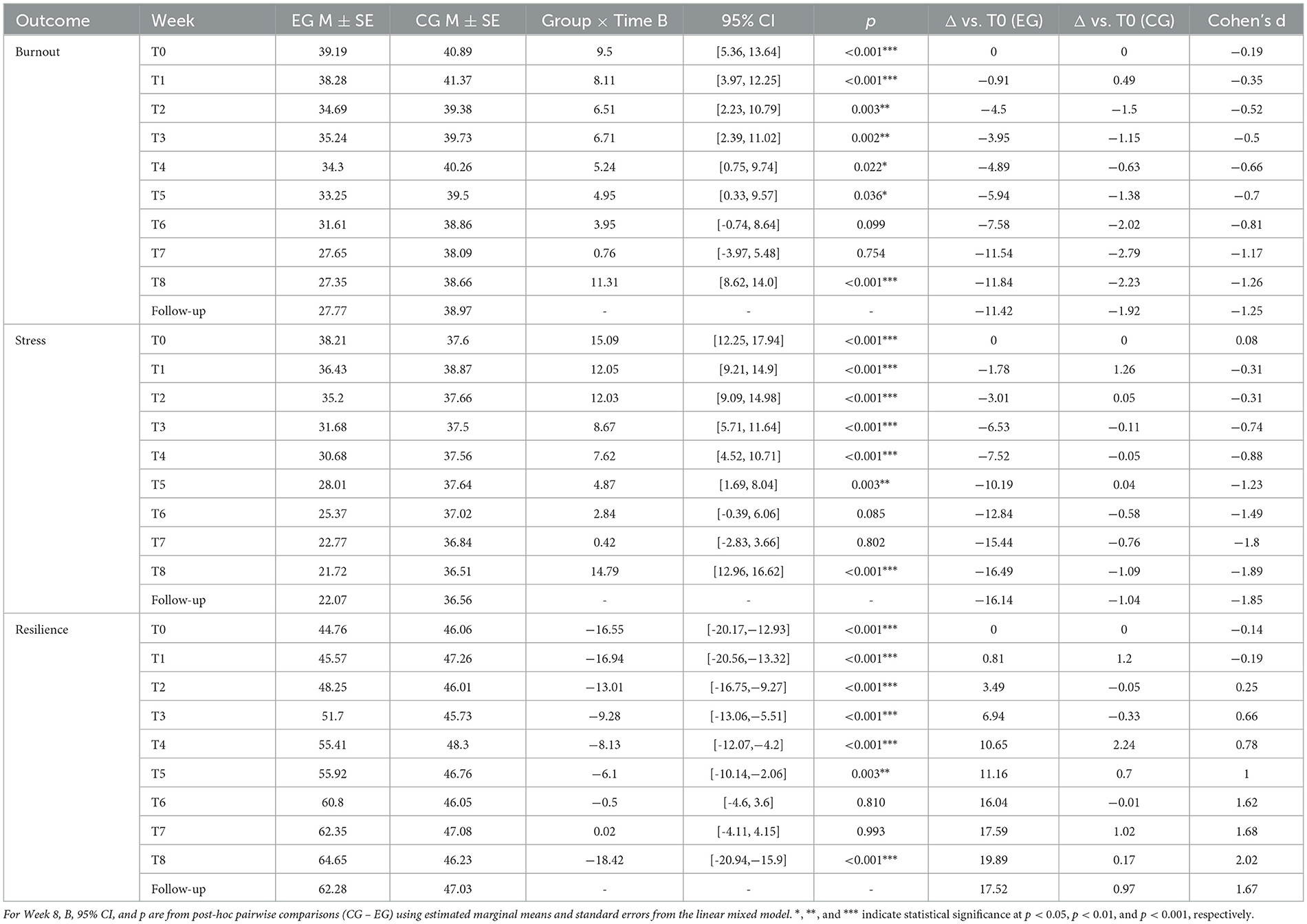 Compared to baseline (T0), significant within-group changes emerged from Week 2 onward and remained consistent at Week 8 and during follow-up. Psychological resilience was associated with a significant upward trend starting from Week 2, reaching its peak in Week 8, and remaining above baseline at follow-up. Similarly, perceived academic stress showed a declining trajectory, with statistically significant changes evident from Week 2 onward.