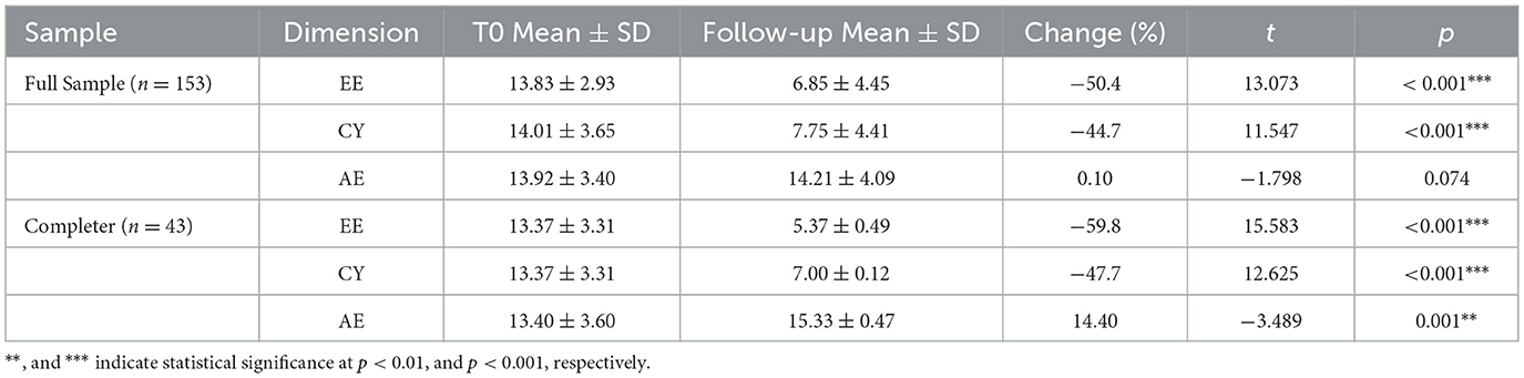 This study found that 8 weeks of mindfulness training led to significant improvements in overall academic burnout. Further examination of the three dimensions revealed the following patterns: EE decreased from an average of 13.37 at baseline (T0) to 5.37 at follow-up, representing a 59.8% reduction, with the paired t indicating a significant effect (t = 15.583, p < 0.001). CY decreased from 13.37 to 7.00, a 47.7% reduction, also significant (t = 12.625, p < 0.001); AE increased from 13.40 to 15.33, a 14.4% improvement, with a significant paired t-test result (t = 3.489, p = 0.0012).
