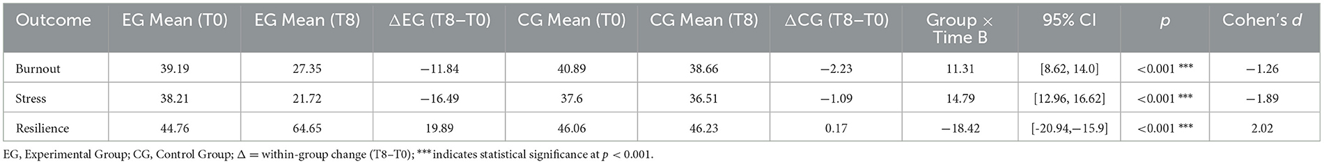 According to Cohen's conventions, effect sizes of |d| ≥ 0.8 are considered large. In the present study, between-group standardized effects at Week 8 ranged from |d| = 1.2 to 2.0, corresponding to large-to-very-large magnitudes. Negative d values indicate reductions in burnout and stress, whereas positive d values reflect increases in resilience, consistent with the predefined directionality of each outcome.