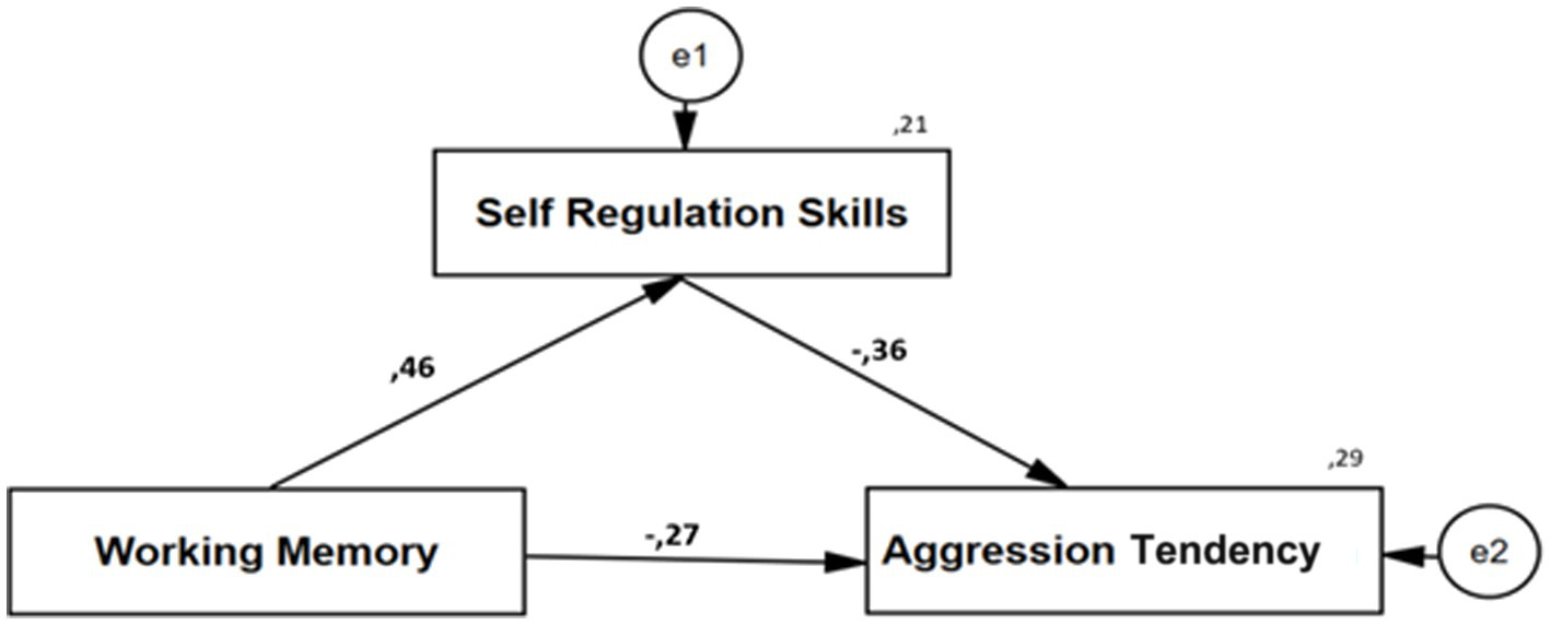 The findings showed that working memory was a positive predictor of self-regulation skills and a negative predictor of aggression tendency. Self-regulation skills negatively predicted aggression tendencies. Additionally, selfregulation skills were identified as a mediating factor in the relationship between working memory and aggression tendency.