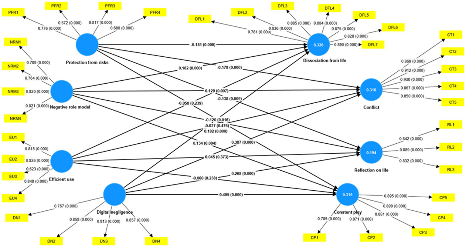 Structural equation modeling revealed that digital negligence and being a negative role model significantly predicted all dimensions of children’s digital play addiction tendency, namely dissociation from life, conflict, constant play, and reflection on life. In contrast, efficient use showed no significant effect. Protective behaviors aimed at minimizing digital risks were significant negative predictors across all addiction dimensions.
