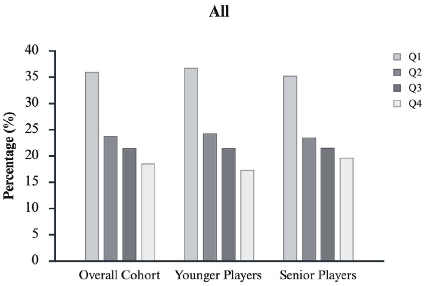 Birth-quartile distribution for the Overall Cohort and for Younger and Senior subgroups. Across all age categories, Q1 players are consistently over-represented and Q4 players under-represented relative to a uniform 25% distribution, with the most pronounced imbalance observed in Younger Players. Full descriptive statistics and inferential results are reported in Table 1.