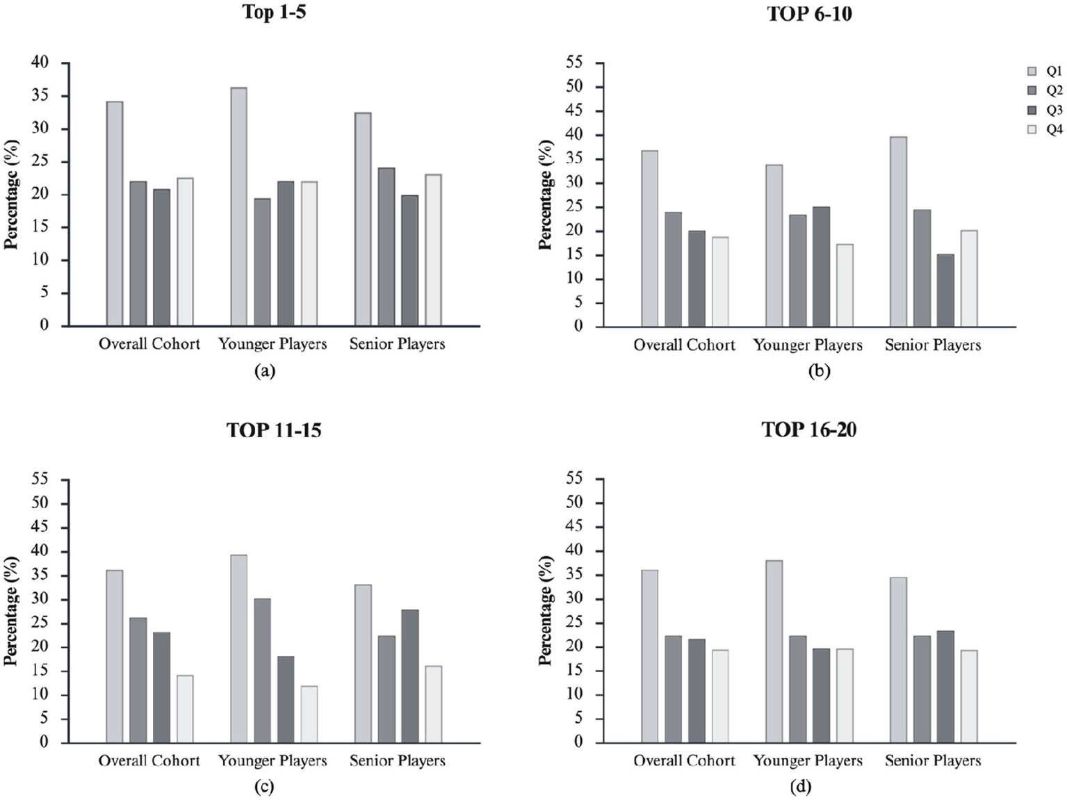 The analysis considers the different playing positions relevant to RAEs in the Younger GK [OR = 3.6 (1.0–12.9)], FW [OR = 2.8 (1.1–7.0)], and MF [OR = 2.4 (1.1–5.3)] players but not in DF [OR = 1.4 (0.7–2.7)]. In contrast, among Senior Players, RAEs persisted with a large effect size in GK and small effect sizes in DF and MF, and disappeared in FW. Nevertheless, for both DF and MF, no significant differences between Q1 and Q4 players were found. Figure 2 presents a visual inspection of the quartile distributions for the Overall Cohort, and Younger and Senior Players stratified by rank level.