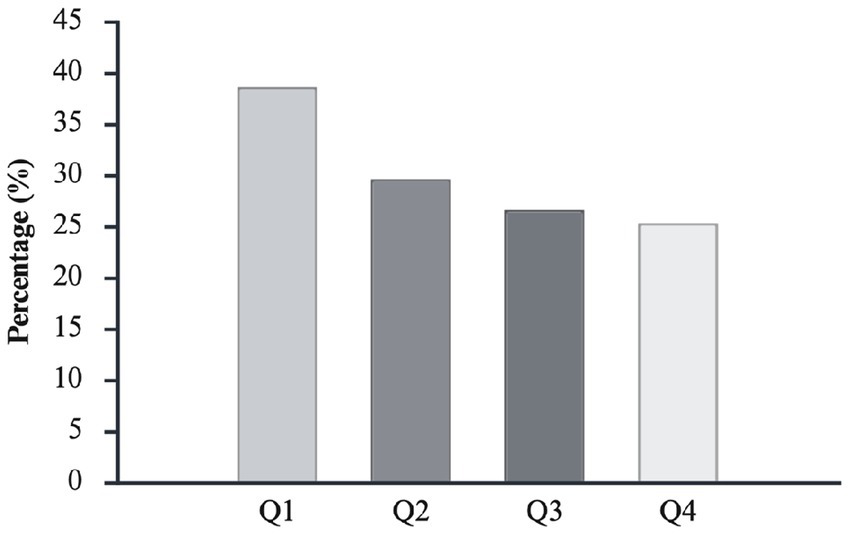Q1, first quartile; Q2, second quartile; Q3, third quartile; Q4, fourth quartile; χ2, chi-squared value; V, Cramer’s V effect size. OR, odds ratio, and 95% confidence intervals [95% CI]; ***p < 0.001; **p < 0.01; *p < 0.05.