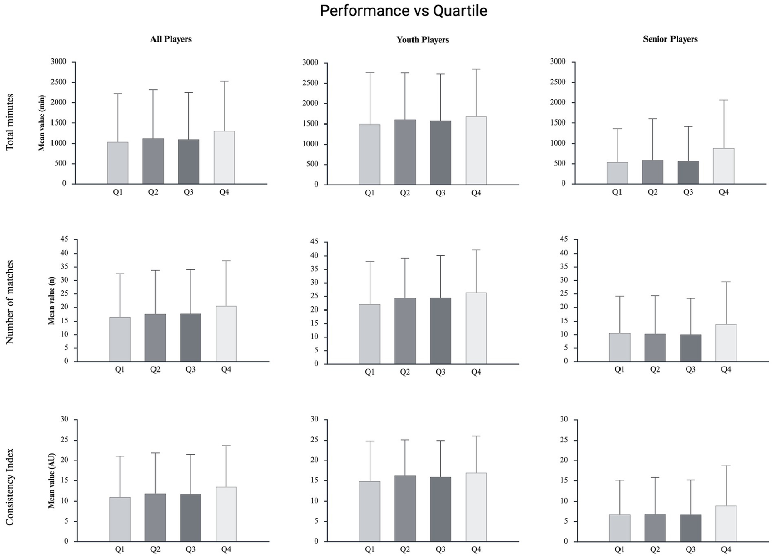 Figure 4 shows the relationship between birth quartiles and selection- and participation-related outcomes (i.e., Total Playing Time, Number of Matches, and Consistency Index) for the Overall Cohort and for the Younger and Senior subgroups.