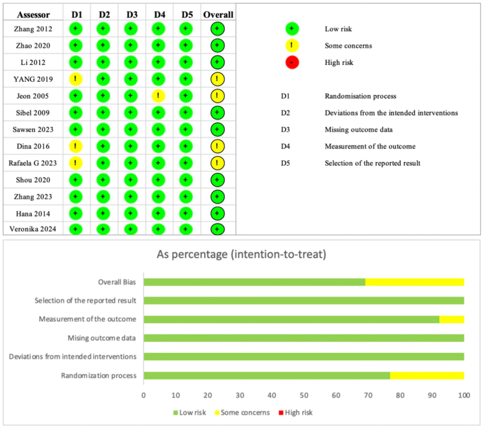 Two researchers independently assessed the risk of bias in the included studies using the Cochrane Handbook for Systematic Reviews of Interventions’ Risk of Bias Assessment Tool for Randomised Controlled Trials (RoB 2.0). The assessment process followed the RoB 2.0 guidance, covering five main domains comprising six items: risk of bias in randomisation, risk of bias due to deviation from the allocated intervention, risk of bias due to missing outcome data, risk of bias in outcome measurement, risk of bias due to selective reporting of outcomes, and other sources of bias. Each item was assigned a distinct score based on the assessed risk of bias: low risk of bias was denoted by “+”; high risk of bias by “−“; and insufficient information to determine risk of bias by “!”.