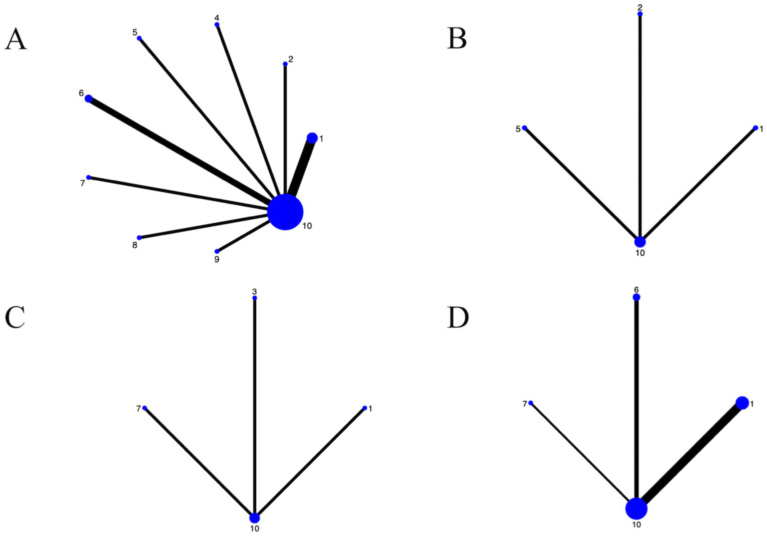 For the network diagrams included in the study. (A) Depression; (B) Well-being; (C) Anxiety; (D) Cognitive function; 1: Chinese square dance; 2: Aerobic dance; 3: Group dance; 4: Rhythmic gymnastics; 5: Turkish folk dance; 6: Creative dance; 7: Poco Poco dance; 8: Dance games; 9: Ballroom dance; 10: Control group.