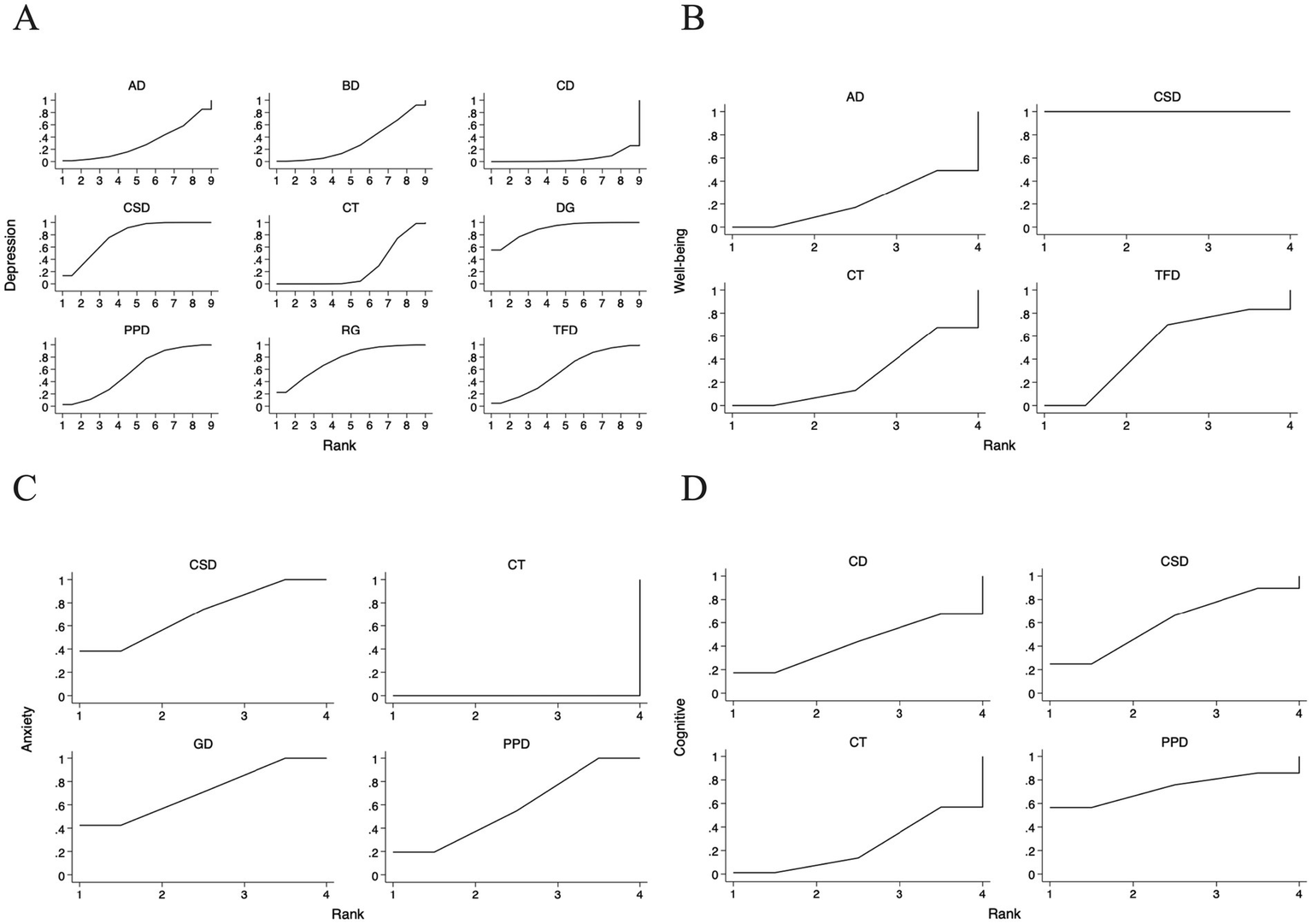 For the sucra sorting chart included in the study. (A) Depression; (B) Well-being; (C) Anxiety; (D) Cognitive function; CSD, Chinese square dance; AD, Aerobic dance; GD, Group dance; RG, Rhythmic gymnastics; TFD, Turkish folk dance; CD, Creative dance; PPD, Poco Poco dance; DG, Dance games; BD, Ballroom dance; CT, Control group.