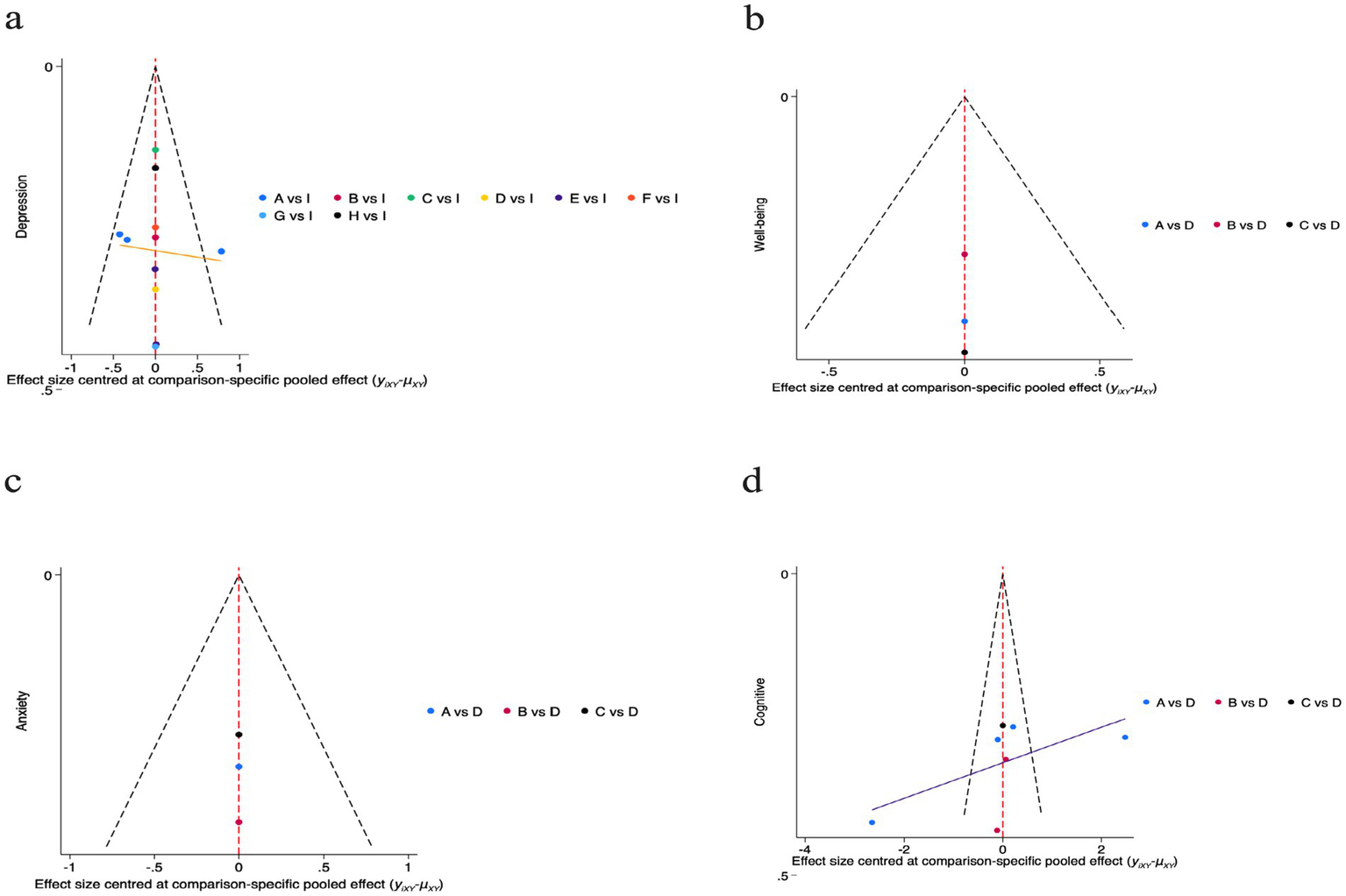 For the funnel plots included in the study. a: Depression; A(a): Chinese square dance; B(a): Aerobic dance; C(a): Rhythmic gymnastics; D(a): Turkish folk dance; E(a): Creative dance; F(a): Poco Poco dance; G(a): Dance games; H(a): Ballroom dance; I(a): Control group; b: Well-being; A(b): Chinese square dance; B(b): Aerobic dance; C(b): Turkish folk dance; D(b): Control group; c: Anxiety; A(c): Chinese square dance; B(c): Group dance; C(c): Poco Poco dance; D(c): Control group; d: Cognitive function; A(d): Chinese square dance; B(d): Creative dance; C(d): Poco Poco dance; D(d): Control group.