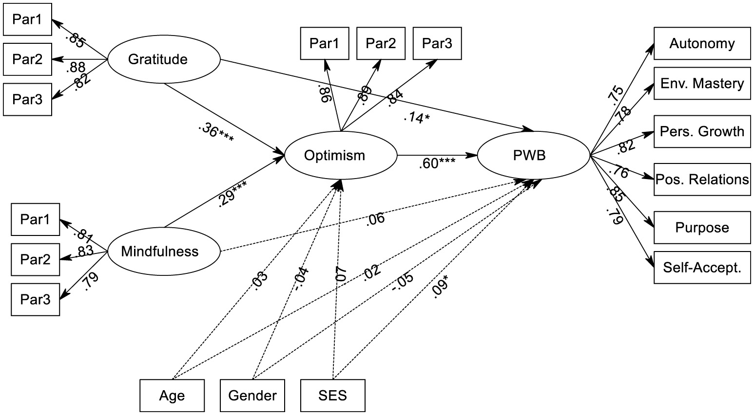 To ensure a rigorous application of Structural Equation Modeling (SEM) rather than a path analysis of observed variables, we employed the item parceling technique (Little et al., 2002). This approach was selected to enhance model parsimony, improve the indicator-to-sample size ratio, and minimize the impact of item-specific measurement error. For the unidimensional constructs (Gratitude and Mindfulness), we created three balanced parcels per construct using the factorial algorithm (Little et al., 2002). For Optimism, although the Life Orientation Test-Revised (LOT-R) is sometimes debated as bi-dimensional (optimism vs. pessimism), we followed the recommendation of Scheier et al. (1994) and seminal validation studies in Chinese university students (e.g., Lai et al., 1998) which support treating it as a unidimensional continuum of generalized positive expectancy. Consequently, we utilized the factorial algorithm to generate three balanced parcels for the single latent Optimism factor, ensuring that both positively and negatively worded items were distributed across parcels to balance method variance. For the multidimensional Psychological Wellbeing (PWB) construct, the six theoretical dimensions (autonomy, environmental mastery, personal growth, positive relations, purpose in life, and self-acceptance) served as the observed indicators for the second-order latent factor.