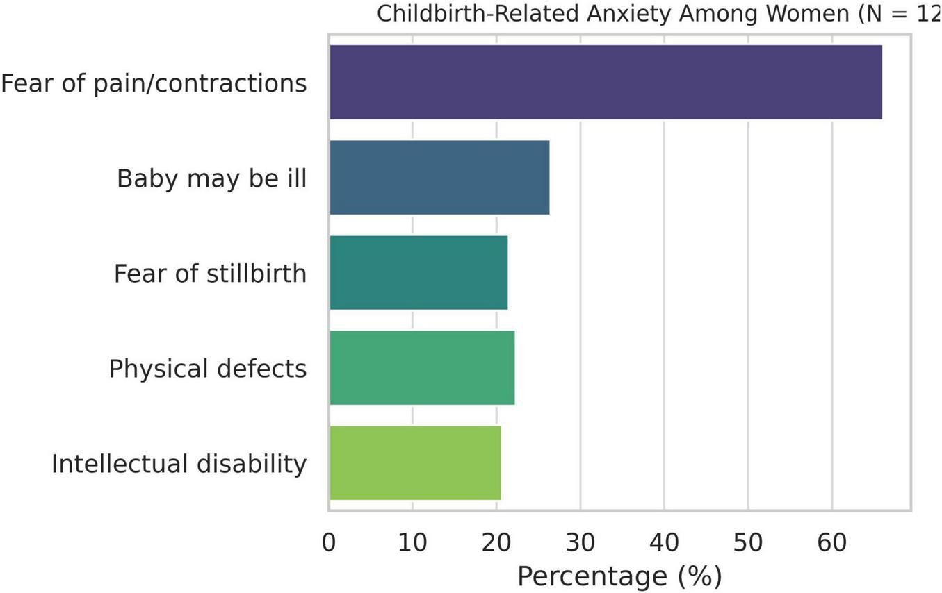 A majority of women reported experiencing childbirth-related anxiety: 31.40% strongly and 27.27% moderately identified with this feeling. A similar pattern was observed regarding fear of labor pain and contractions (34.71% strongly, 31.40% moderately). The most frequent concerns were related to the baby’s health: 26.45% feared the baby might be born ill, 22.31% feared physical defects, 21.49% feared stillbirth, and 20.66% feared intellectual disability (Figure 3). Concerns about body image were less frequent (14.88% feared excessive weight gain), as were fears of losing control during labor (12.40% reported this strongly).