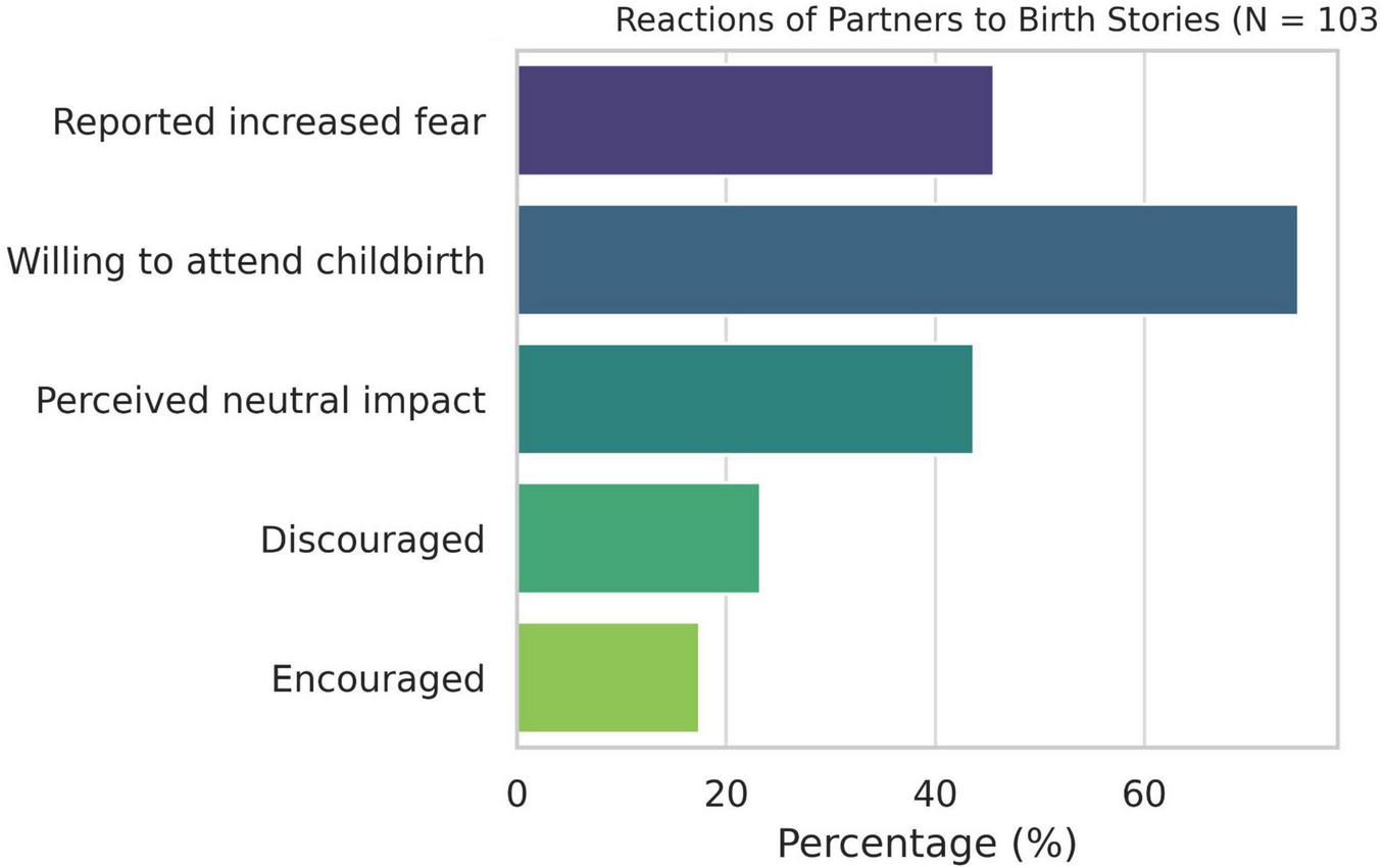 The central finding of this study is that the emotional tone of birth stories meaningfully shapes childbirth – related anxiety and perinatal attitudes in both women and their partners. Women who perceived the stories they encountered as negative were significantly more likely to report heightened childbirth anxiety, stronger doubts about their ability to give birth, and a greater inclination toward cesarean delivery. In contrast, exposure to positive or empowering narratives was associated with lower anxiety levels and increased motivation for vaginal birth. Among partners, negative narratives similarly predicted elevated anxiety about their partner’s labor. These results underscore that birth stories function as influential psychosocial stimuli that can amplify or mitigate fear of childbirth, shaping expectations and decision – making within the perinatal period. The findings of the present study contribute to the growing body of evidence highlighting the complex role of pregnancy-related anxiety (PrA) and the influence of birth narratives on women’s emotional experiences, decision-making, and birth outcomes (Mahdavi et al., 2022, 2025). Consistent with previous research, we observed a high prevalence of anxiety among participants, with nearly two-thirds reporting anxiety in response to hearing birth stories and more than half stating that such narratives increased their childbirth-related fears. This aligns with prior studies showing that PrA is a common psychological phenomenon affecting a substantial proportion of pregnant women, with prevalence estimates ranging from 18% to 25% across trimesters (Dennis et al., 2021). The retrospective recall of narrative exposure provides insight into the longer-term interpretive and emotional significance of birth stories, but it does not allow conclusions about temporal or causal ordering. Women’s satisfaction with their own birth experience and their recalled antenatal anxiety refer to distinct time points and are interpreted independently in the manuscript. Our results reinforce the view that PrA is a distinct construct with significant implications for maternal wellbeing and perinatal outcomes (Huizink et al., 2004; Blackmore et al., 2016; Anderson et al., 2019). The finding that over half of women perceived increased anxiety following exposure to birth stories is consistent with qualitative research indicating that negative or mixed narratives can amplify fear and undermine women’s confidence in their birthing abilities (Melender, 2002; Kay et al., 2017; Mahdavi et al., 2025). This phenomenon may reflect the cognitive and emotional processes described by Bayrampour et al. (2016), whereby perceived threats, low self-efficacy, and heightened cognitive engagement are key precursors to PrA. Indeed, in our sample, more negative perceptions of birth stories were associated with greater self-doubt about childbirth, underscoring the importance of perceived control and self-efficacy in shaping maternal anxiety (Dunkel Schetter and Tanner, 2012).