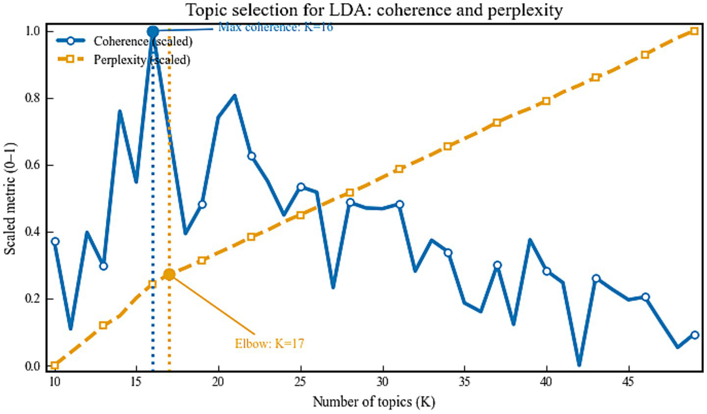 Latent Dirichlet Allocation (LDA) was used to recover latent thematic structure. The number of topics was selected with a dual criterion that combined the maximum of topic coherence and the elbow of log perplexity, both rescaled to a common axis for comparability (Figure 2). Coherence reached its maximum at , whereas log perplexity decreased monotonically with and exhibited an elbow at approximately . To balance statistical fit with semantic interpretability, was retained.