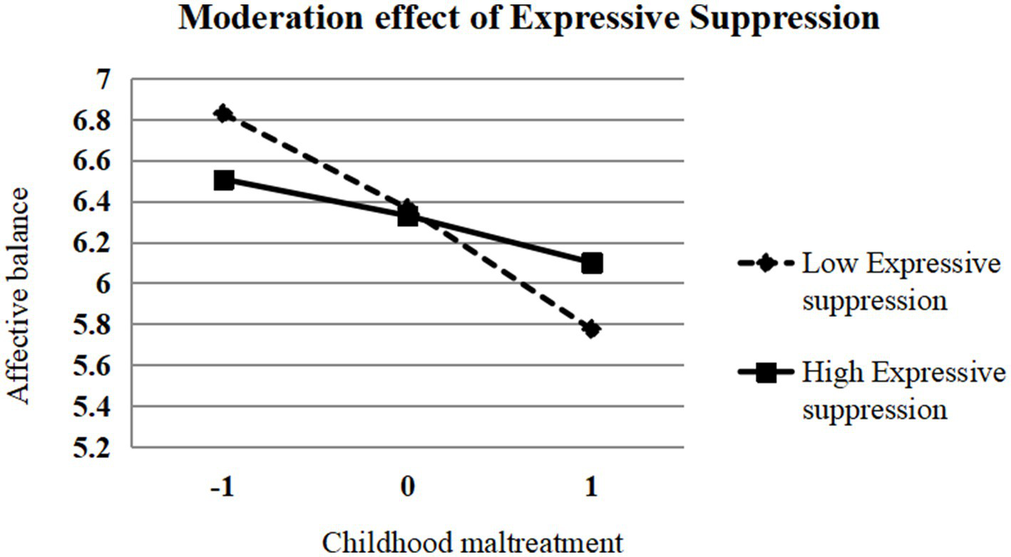 To test the moderating effect of expressive suppression on the relationship between childhood maltreatment and affective balance, PROCESS macro (Model 7) was used. As presented in Table 2, childhood maltreatment significantly negatively predicted affective balance (β = −0.035, t = −9.82, p < 0.001, 95% CI [−0.042, −0.028]), while the main effect of expressive suppression on affective balance was not significant (β = −0.004, t = −0.44, p > 0.05, 95% CI [−0.021, 0.013]).