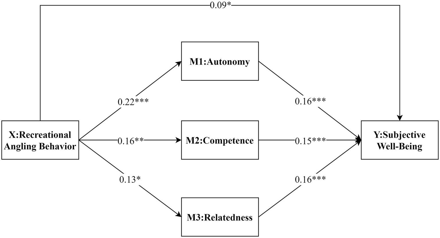 Spearman’s rank-order correlation coefficients among subjective well-being, recreational angling behavior, autonomy, competence, and relatedness were calculated, as shown in Table 1. Subjective well-being was significantly and positively correlated with recreational angling behavior, autonomy, competence, and relatedness at the 0.01 level. The significant correlations among the study variables provide a prerequisite for the subsequent mediation analyses.