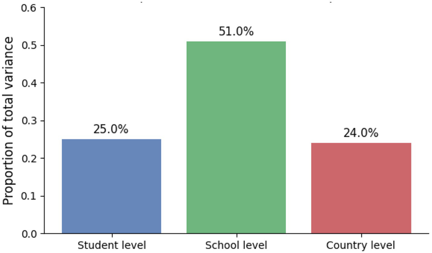 Given the hierarchical nature of the data—students nested within schools, and schools nested within countries—a multilevel modeling framework was implemented to appropriately partition variance in STEM achievement across these levels. This approach enabled a nuanced examination of how individual-level cognitive and socio-economic resources, alongside school-level environmental factors, contribute to students’ performance (Raudenbush and Bryk, 2002).