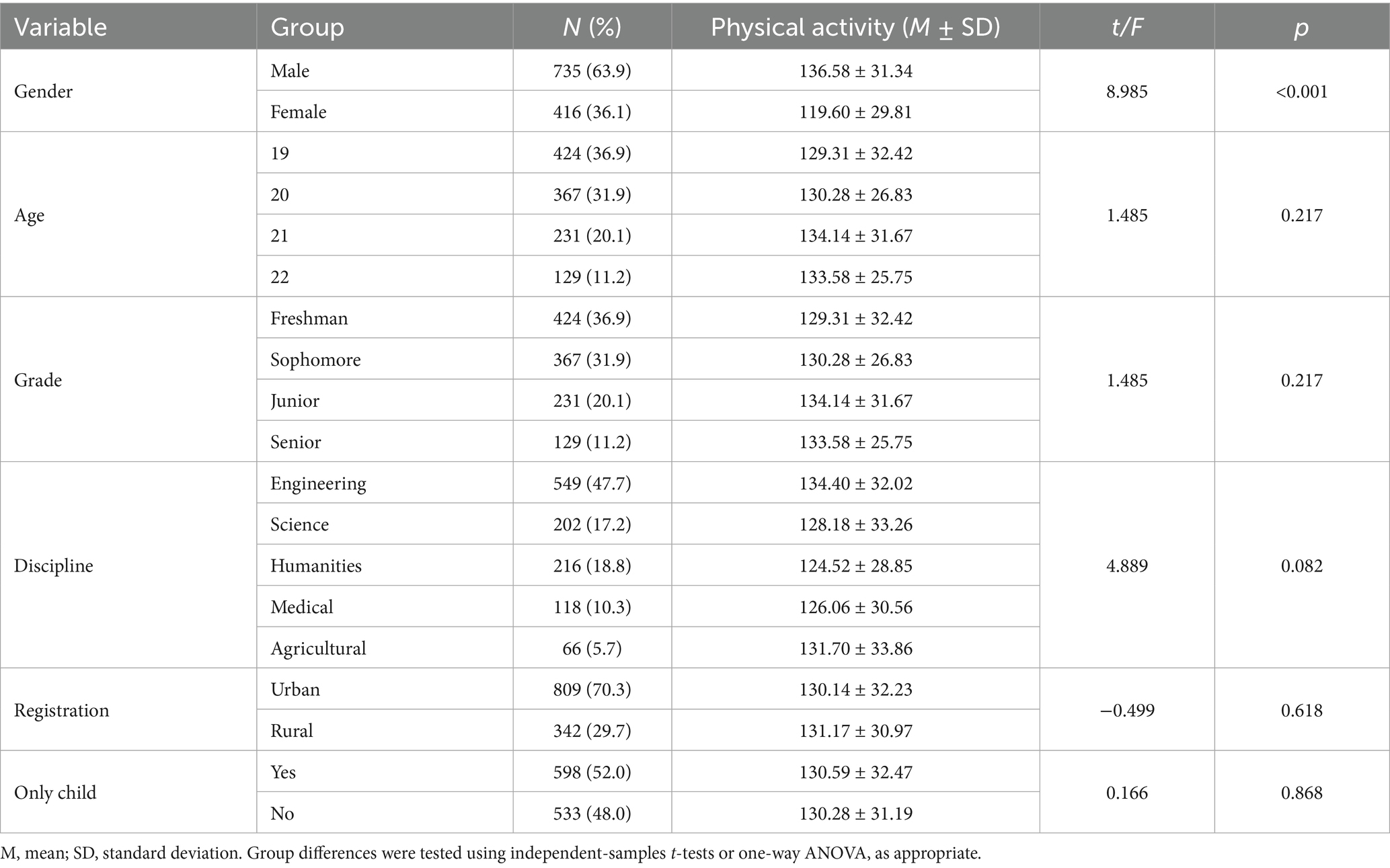 A total of 1,200 questionnaires were distributed. The screening criterion was “more than 25% missing responses,” and finally, 1,151 valid data were obtained, with an effective recovery rate of 95.8%. Key results from the analysis of physical activity in the college student group showed that males (n = 735, 63.9%) had a significantly higher mean value (M = 136.58, SD = 31.34) than females (n = 416, 36.1%, M = 119.60, SD = 29.81), with a statistically significant difference (p < 0.001). There were no statistical differences in age, grade, major, household registration location, and whether being an only child (p > 0.05). The results are shown in Table 1.