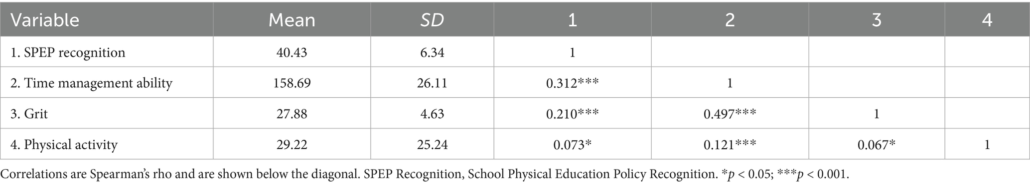 3.3 Score status and correlation analysis of sports policy, time management, grit, and physical exercise