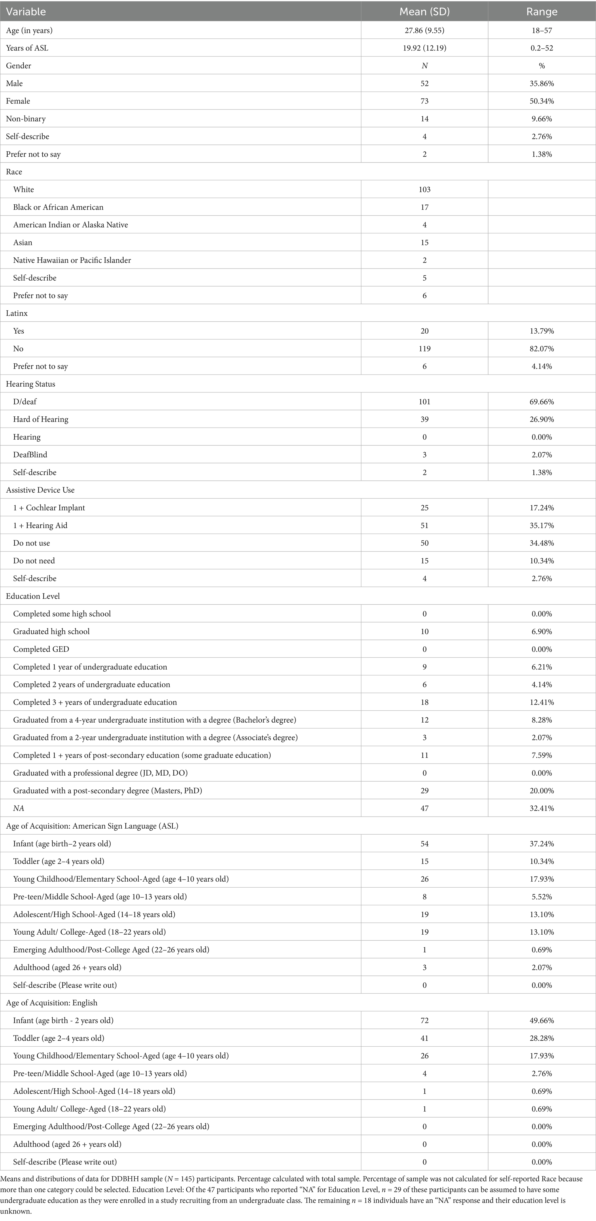 For this sample of DDBHH individuals, we also had participants report their hearing status, use of assistive devices for access to sound (e.g., cochlear implants, hearing aids, etc.), age of acquisition for ASL and English, and number of years using ASL. Participants also reported their education level.