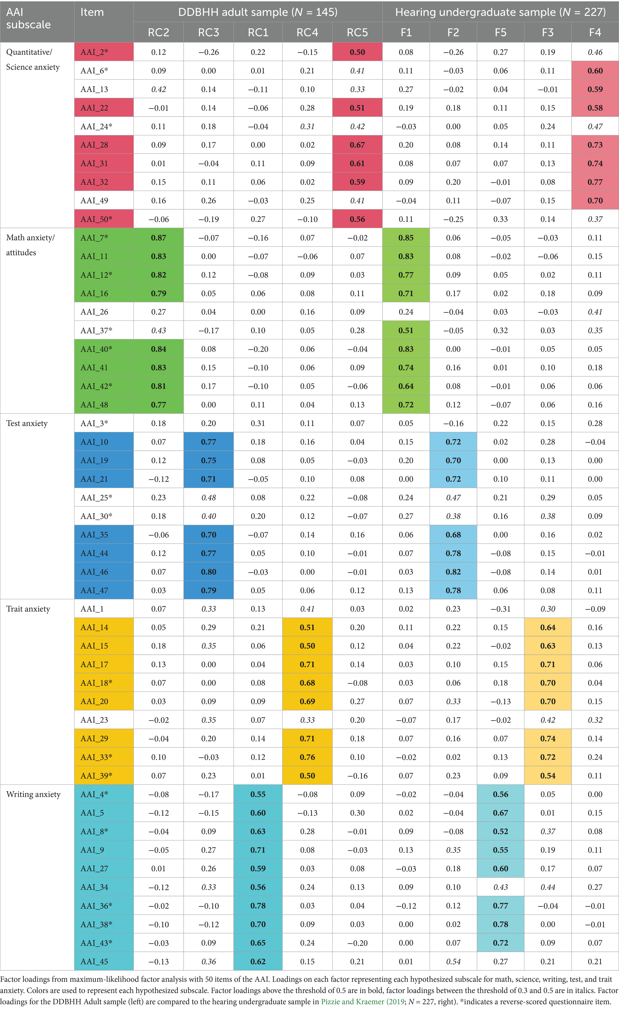Although much of the results of this study confirmed similar results to the original psychometric analysis, it is also important to consider the variability in results, as well. In this study, factor structure was highly correlated to the factor structure in the original validation analyses (RQ 1b; Pizzie and Kraemer, 2019). However, this correlation between factor structures was lower than the intercorrelation reported in the original paper between a hearing adult sample and adolescent sample. Although the correlation between factor structures of the DDBHH and original validation sample of hearing adults is still very high, there are some important considerations related to our DDBHH sample that may have slightly decreased this correlation. Our sample size (N = 145) is smaller than the original validation sample and may be more heterogeneous with regard to language and educational backgrounds. Moreover, DDBHH individuals were responding to a bilingual version of the AAI instead of a monolingual English version, which may have slightly altered response patterns. Interestingly, one way in which responses may have differed between samples is that we observe more consistent factor loadings along the writing anxiety subscale in the DDBHH sample (two items were below the 0.5 threshold in the original validation sample). All these factors may have contributed to slightly lower correlation between the DDBHH sample and the original validation sample, though these patterns of responses are still highly correlated.