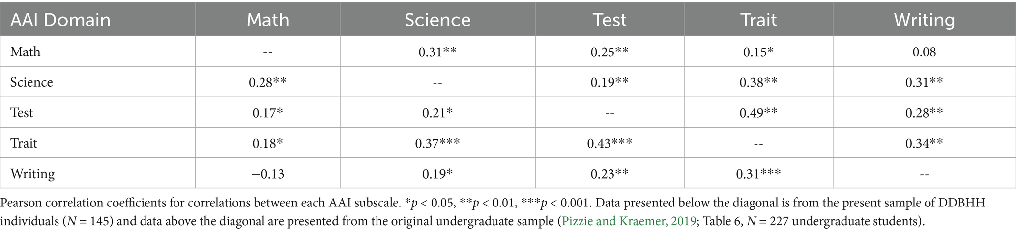 Our next analysis was designed to test the alignment between the item-wise factor analysis and our previously reported results with a hearing sample (Table 2; Table 5, Pizzie and Kraemer, 2019). Replicating a previous analysis in the original validation of the AAI, we correlated the matrices of these factor results with our current DDBHH sample (N = 145) with the previously published sample of hearing young adults (N = 227; see Pizzie and Kraemer, 2019 for demographic information about this sample). We used a Pearson correlation to correlate the hypothesized overall factor structures, aligning each hypothesized factor column in the same order, such that the hypothesized factor for “math” appeared in the same column in both datasets (see Table 2). Across both the DDBHH and hearing samples, the factor structures were highly correlated with one another, r(248) = 0.78, p < 0.001, 95% CI = [0.725, 0.824], r2 = 0.61. Although the magnitude of this correlation is significantly less than the correlation reported between the undergraduate sample and sample of high schoolers in the original publication (r(248) = 0.86, p < 0.001, r2 = 0.74, comparing correlation size: Z = 3.28, p < 0.001), it is clear that the factor structures are still highly and significantly correlated between the DDBHH and hearing samples. We also correlated the factors within each domain between the DDBHH and hearing factor analyses, calculating the Pearson correlation between the columns matching the subscale domains and found high correlations between domains: Math: r = 0.77 (r2 = 0.59), Science: r = 0.80 (r2 = 0.64), Writing, r = 0.82 (r2 = 0.67), Test: r = 0.83 (r2 = 0.69), Trait: r = 0.78 (r2 = 0.61).