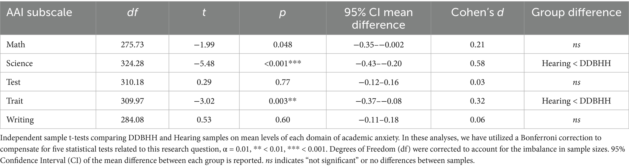 Table 4. Comparing mean scores on each AAI subscale between DDBHH (N = 145) and Hearing (N = 227) samples.