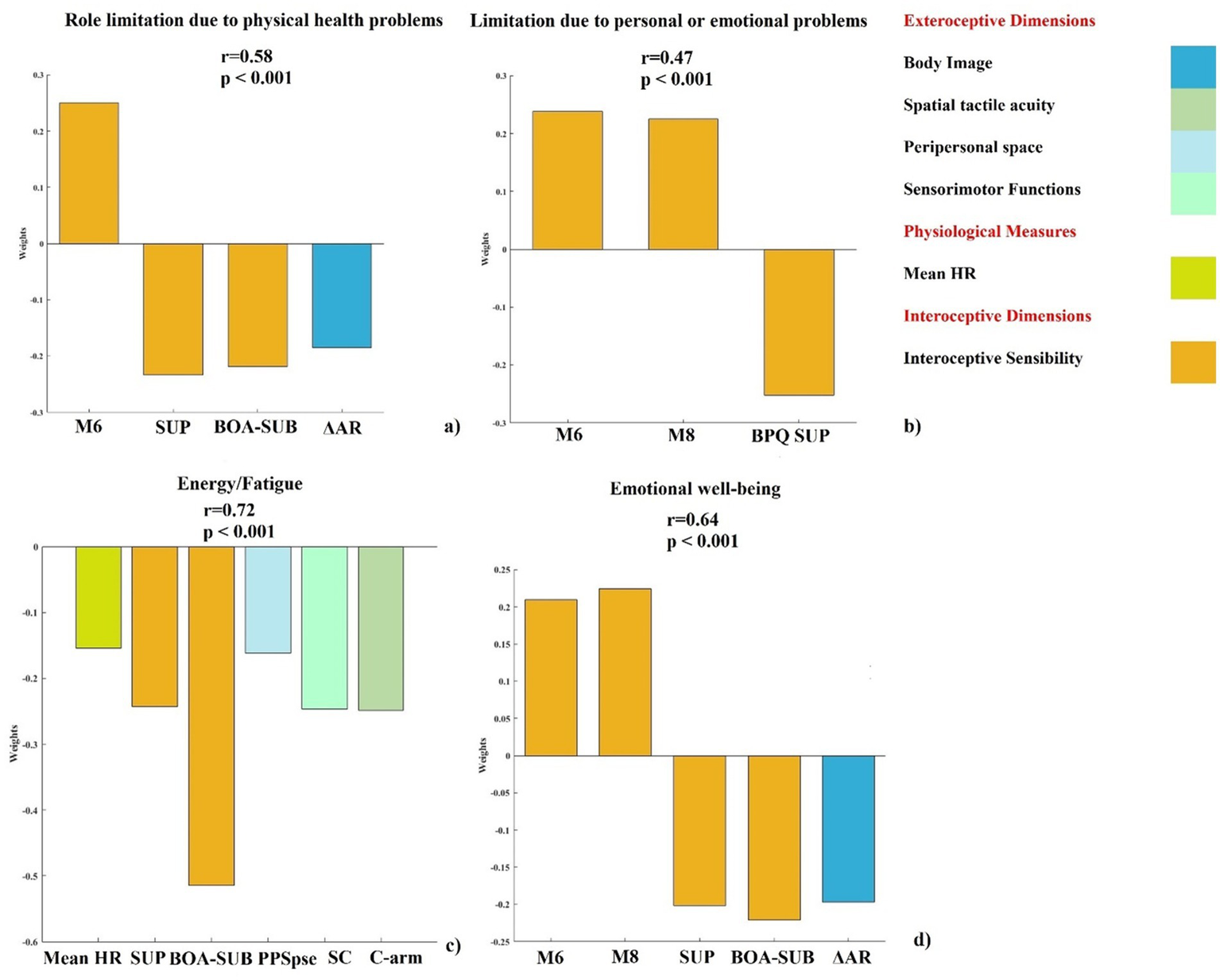 In the second step, PLSR models were constructed only for those SF-36 dimensions significantly predicted in the first step. The significant interoceptive predictors were combined with body representation measures, including: body image (ΔAR), tactile acuity (C-che, C-arm), body structural representation (HIT), multisensory integration (AUC-av, AUC-at, AUC-vt), multisensory temporal resolution (JND-sj), peripersonal space (PSE-pps), temporal tactile acuity (JND-toju), and sensorimotor function (JND-tojc, SC, MRE-lh, MRE-rh).
