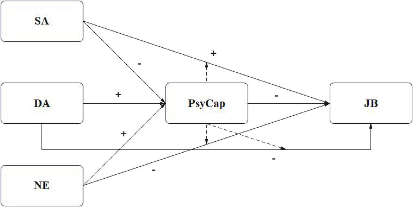 Prior to hypothesis testing, the suitability of the data for parametric analyses was assessed. The core variables showed acceptable descriptive statistics: SA (M = 2.54, SD = 0.98), DA (M = 3.48, SD = 0.91), NE (M = 3.70, SD = 0.70), JB (M = 1.95, SD = 0.96), and PsyCap (M = 4.52, SD = 0.69). Their skewness (absolute values: 0.12–0.93) and kurtosis (absolute values: 0.42–2.26) fell within acceptable ranges (e.g., below |2| and |7|, respectively), indicating no severe non-normality. Although Shapiro-Wilk tests were significant (p < 0.001)—a common outcome in large samples (N = 744) due to high test sensitivity—the observed distribution shapes, combined with the large sample size (which ensures robustness via the Central Limit Theorem) and visual checks verifying no extreme outliers, supported the use of parametric regression-based analyses as planned. Diagnostic checks on the regression models (e.g., residual plots) further verified that the key assumptions of independence, normality, and homoscedasticity were reasonably met.
