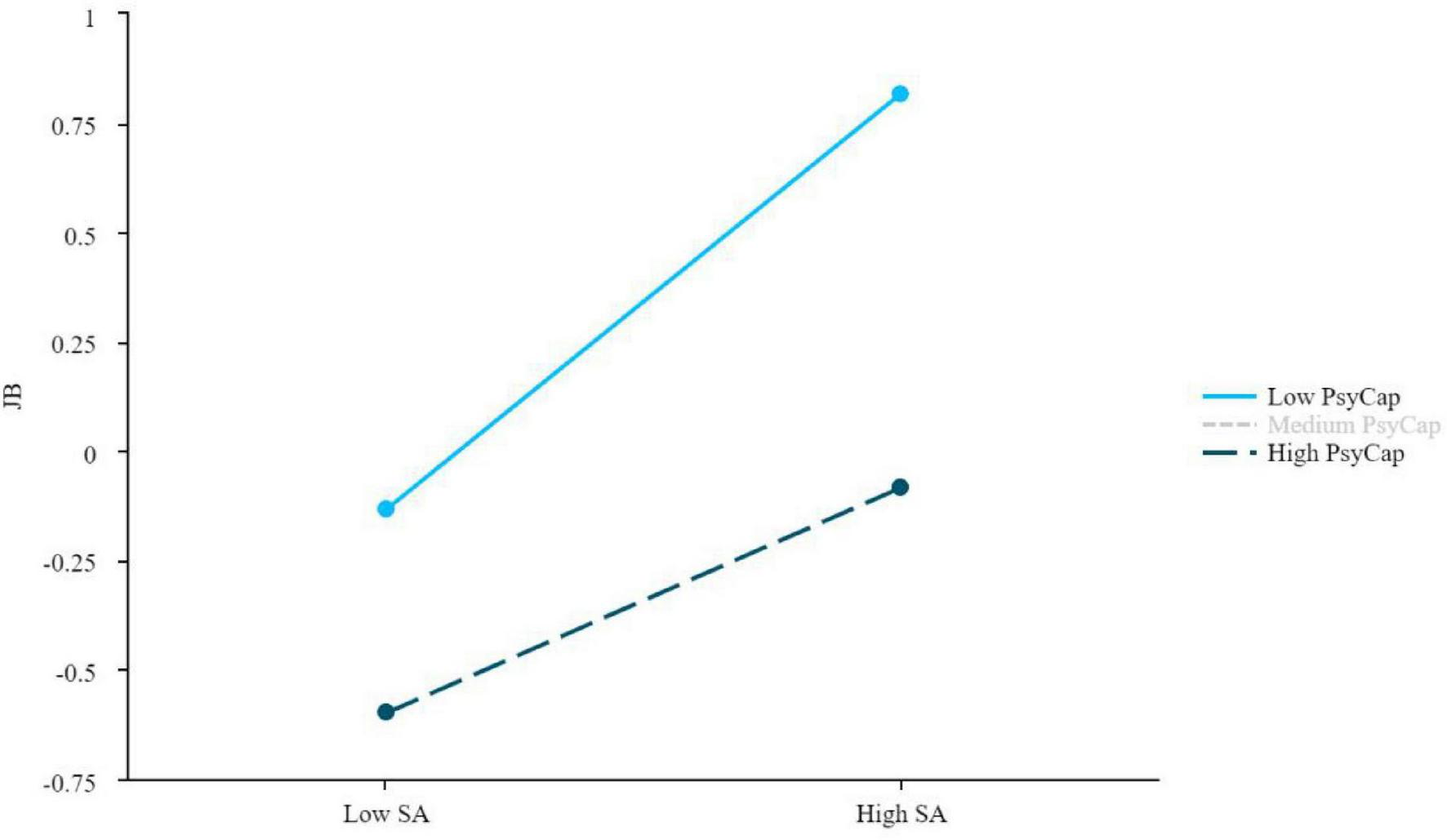 Moderating effect of PsyCap between SA and JB. JB, job burnout; SA, surface acting; PsyCap, psychological capital.