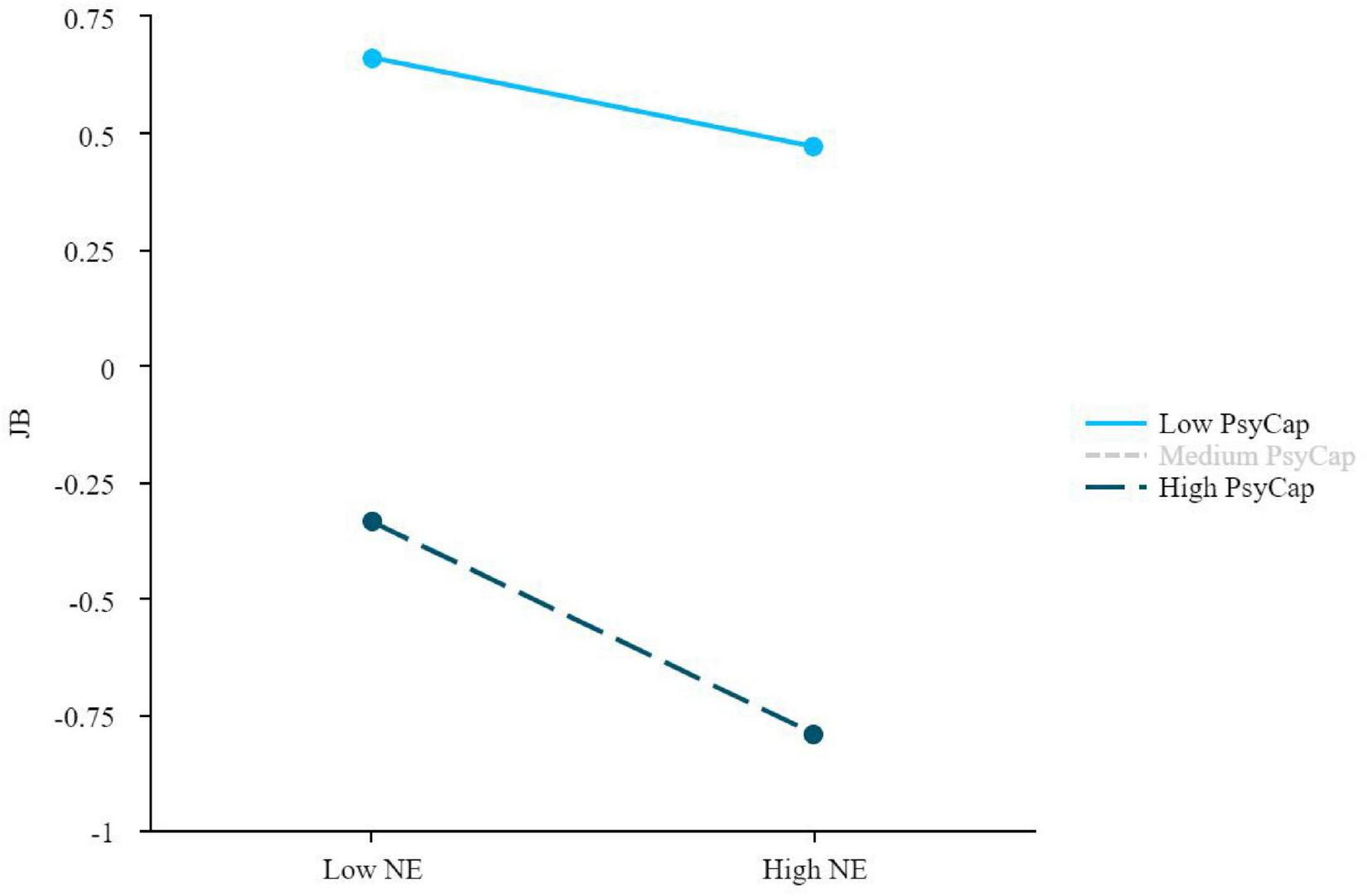 Moderating effect of PsyCap between NE and JB. JB, job burnout; NE, nature expression; PsyCap, psychological capital.