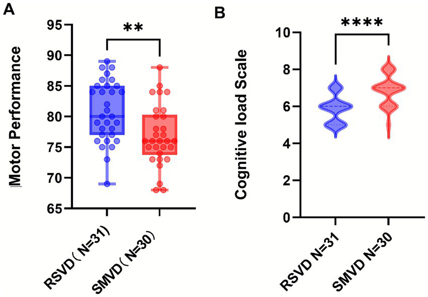 Statistical chart of differences in action display scores and cognitive load scale. (A) is differences of action display scores; (B) is differences of cognitive load scale; p-values: **** indicates p < 0.0001; ** indicates p < 0.01.